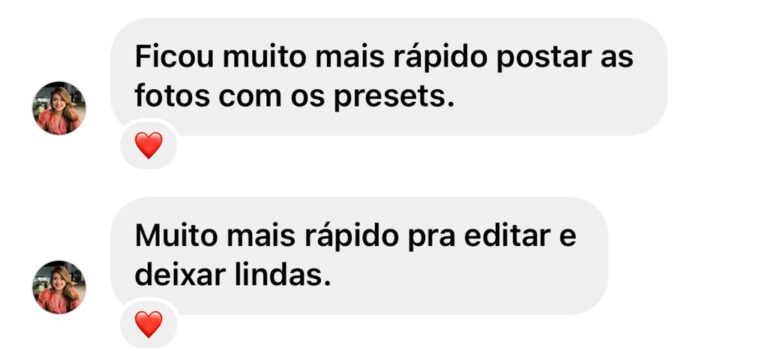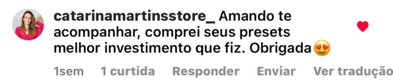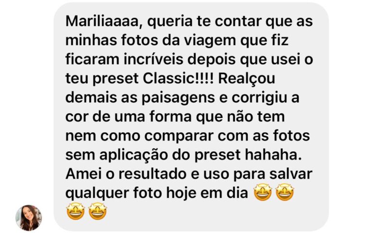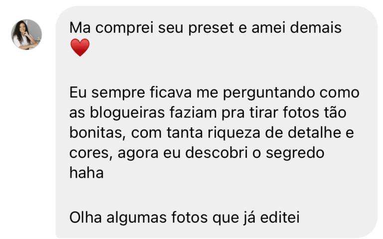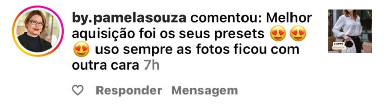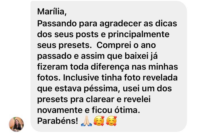 “A diferença das fotos com os Presets é incrível, as fotos ficam com muito mais luz, qualidade e ganham vida!! Obrigada!! 🥰”